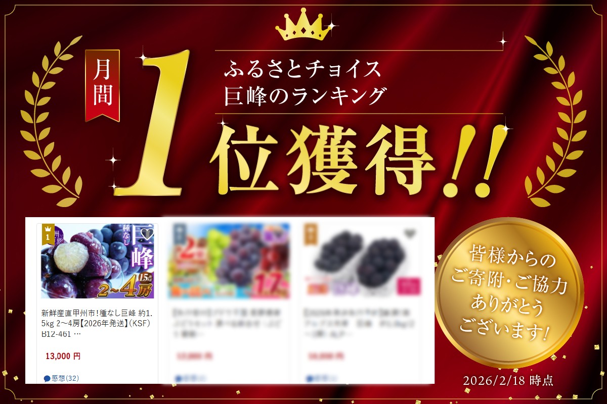 新鮮産直甲州市!種なし巨峰 約1.5kg 2~4房【2025年発送】(KSF)B12-461 【巨峰 葡萄 ぶどう ブドウ 令和7年発送 期間限定 山梨県産 甲州市 フルーツ 果物】