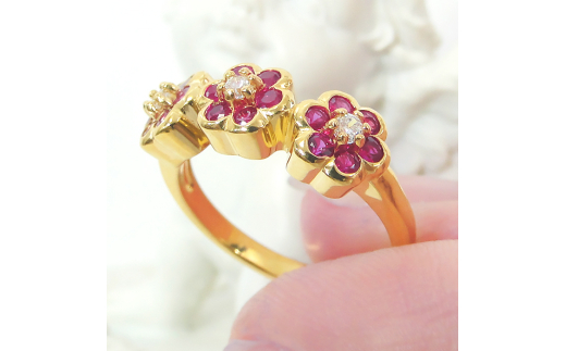 指輪 K18YG イエローゴールド ルビー ダイヤモンド 0.1ct 3連 フラワーモチーフ レディースリング【f264-k18yg-ru】 ※10号 ALPAZ104-10