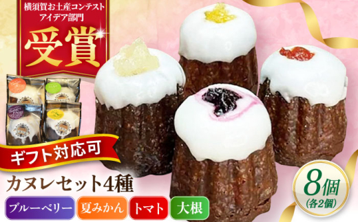コンテスト受賞作品 カヌレセット8個入(ブルーベリーカヌレ2個 夏みかんカヌレ2個 トマトカヌレ2個 大根カヌレ2個) 個包装 スイーツ デザート ギフト対応 プレゼント包装 メッセージカード 横須賀 【パティスリーハダ】 [AKAM009]