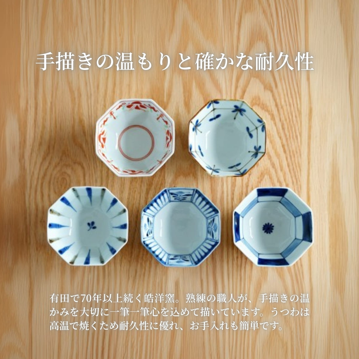 - 【ふるさと納税】【おうちで楽しむ】リム八角 深小鉢 絵変り 5個セット【皓洋窯】有田焼 和食器 食器 うつわ 器 小鉢 5柄セット セット 染付 赤絵 手描き シンプル 惣菜 おしゃれな小鉢 ギフト 40000円 4万円 A40-341