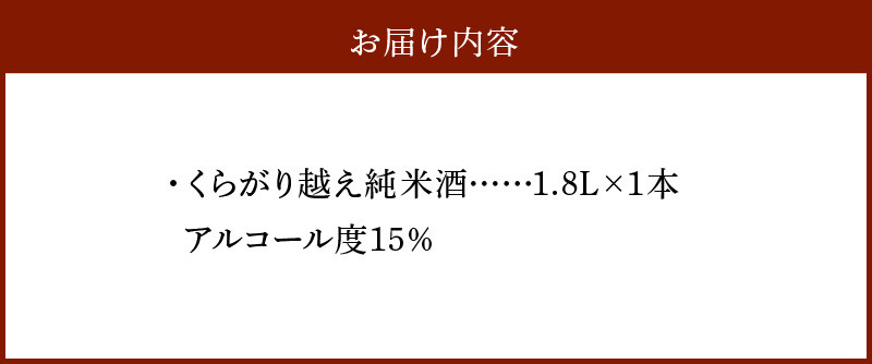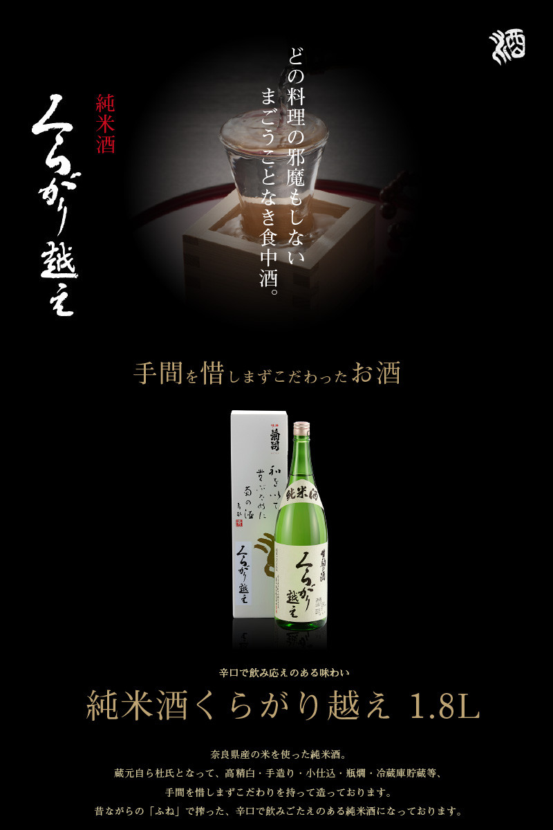 くらがり越え純米酒 1.8L 酒 純米酒 くらがり越え 1.8L アルコール 度数15% 銘酒 天然水 生駒山 自然 まろやか 酵母 手造り 江戸時代 昔ながら 奈良県産米使用 創業300年 お取り寄せ 飲料 飲み物 菊司醸造株式会社 奈良県 生駒市 送料無料