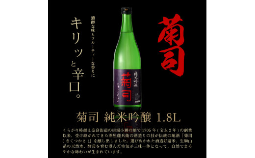 菊司 純米吟醸 1.8L 濃醇な味とフルーティーな香り 菊司 純米吟醸 1.8L 1本 アルコール 度数 15% 辛口 食中酒 酒造好適米 高度精白 醸造 贈り物 お取り寄せ お酒 晩酌 菊司醸造株式会社 奈良県 生駒市 送料無料