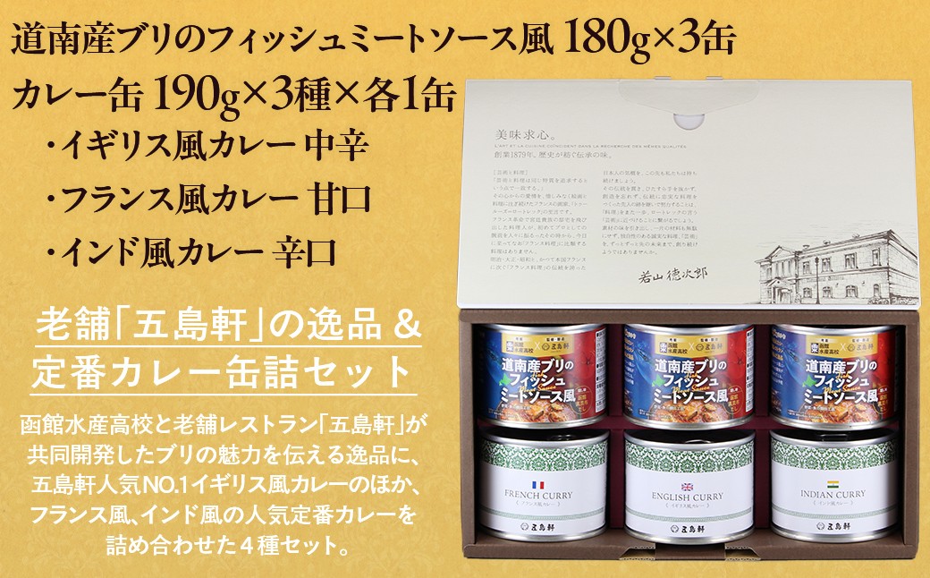 - 五島軒 道南産ブリのフィッシュミートソース風&缶詰カレーギフト 【 ふるさと納税 人気 おすすめ ランキング ミートソース ぶり ブリ フィッシュ 魚 道南産 老舗レストラン 函館水産高校 トマトソース ミンチ 北海道 北斗市 送料無料 】 HOKE012