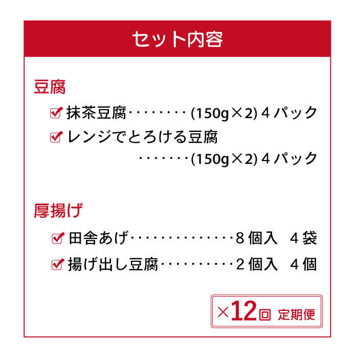 - 【ふるさと納税】【12回定期便】大屋のこだわり 豆腐4種 計16袋 セット(豆腐・スイーツ豆腐・厚揚げ詰め合わせ)【大屋食品工業】[OAB018] / とうふ トウフ 抹茶豆腐 揚げ出し 健康 美容 栄養 ヘルシー ダイエット 大豆 ソイ デザート 鍋 おやつ 冷蔵 ご当地グルメ 味噌汁