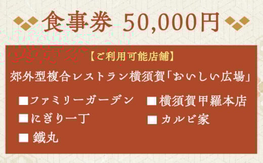 おいしい広場(ファミリーガーデン、横須賀甲羅本店、にぎり一丁、カルビ家、鐡丸) 食事券 50000円分 食事券 横須賀 レストラン 洋食 寿司 焼肉 カニ 蟹 蕎麦 ファミリー 食事 【日本水産観光株式会社】 [AKBR005]
