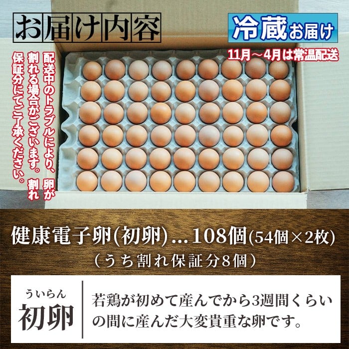 初卵! 健康電子卵 赤卵 108個(54個×2トレー)(うち、割れ保証分8個)国産 鹿児島県産 鶏卵 若鶏が初めて産んでから3週間くらいの間に産んだ大変貴重な卵【A-1818H】