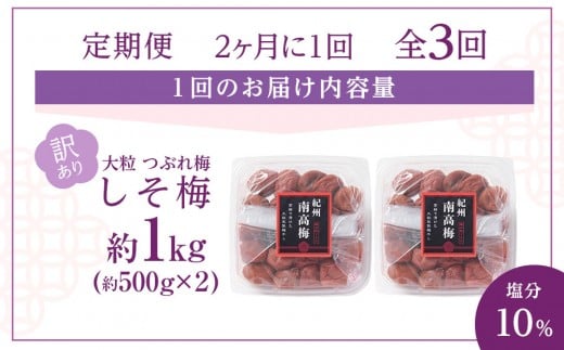 - 訳あり 梅干し 大粒 大玉 つぶれ梅 しそ梅 約1kg (500g×2) × 3回 塩分10% [ 定期便 2か月に1回発送・全3回 ]