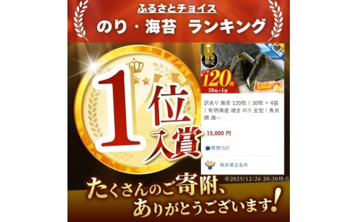 - 訳あり 海苔 120枚 ( 30枚 × 4袋 ) 有明海産 焼き のり 全型 | 魚貝類 海産物 焼海苔 焼き海苔 有明海 訳アリ 熊本県 玉名市