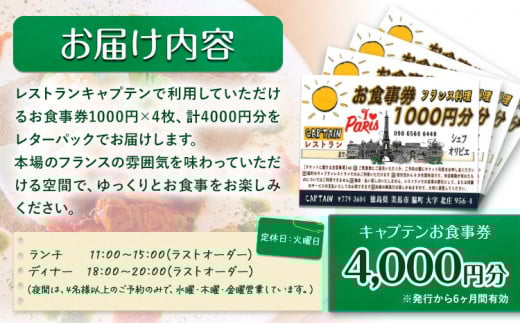 - フレンチレストラン お食事券 CAP’TAIN 4000円分《30日以内に出荷予定(土日祝除く)》ふるさと納税 徳島県 美馬市 フレンチ キャプテン 食事券 チケット 送料無料
