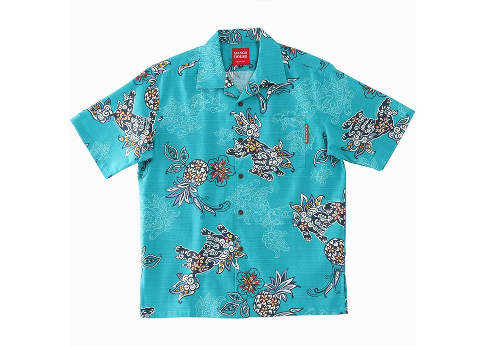 【かりゆしウェア】メンズ いちゃりばシーサーパインMサイズ×ライトブルー