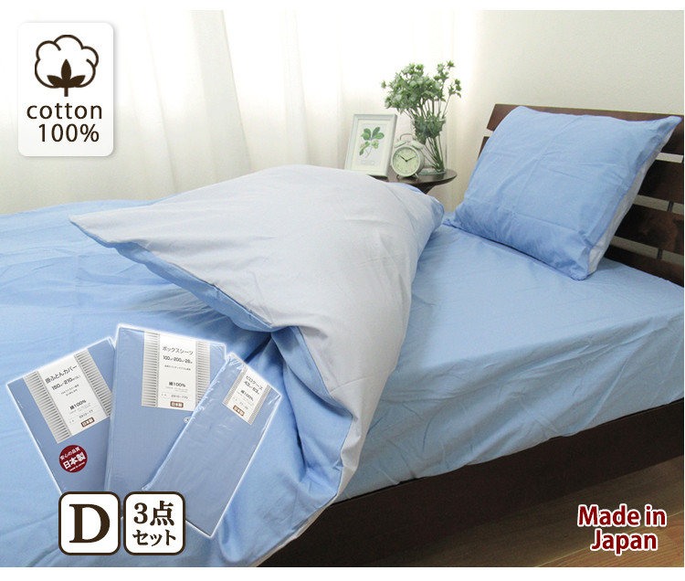 - [ダブル] 日本製 綿100% ふとんカバー掛・敷・枕3点セット 無地 ブルー C0-D-BL [1792]