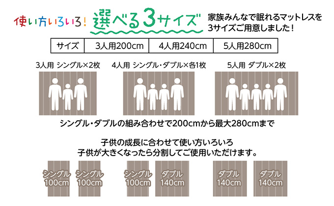 幸せを呼ぶ!?家族みんなで眠れる つなげて使える マットレス 3人用 幅200cm 厚さ8cm