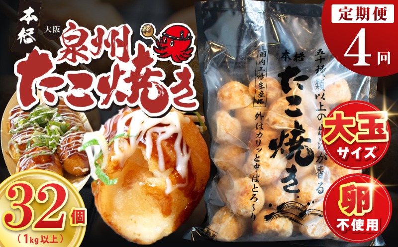 - 099Z297 \卵不使用/本場大阪泉州たこ焼き 急速冷凍でふわとろ食感 1kg以上 約32個 定期便 全4回【毎月配送コース】
