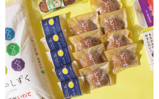 - きたかみの魅力を一箱に!きたかみギフト物産ボックス 詰め合わせ セット 米 お米 地元食品 銘菓 まとめ ダンボール 主食 菓子 特産物 岩手県北上市 J0165 株式会社 菓団