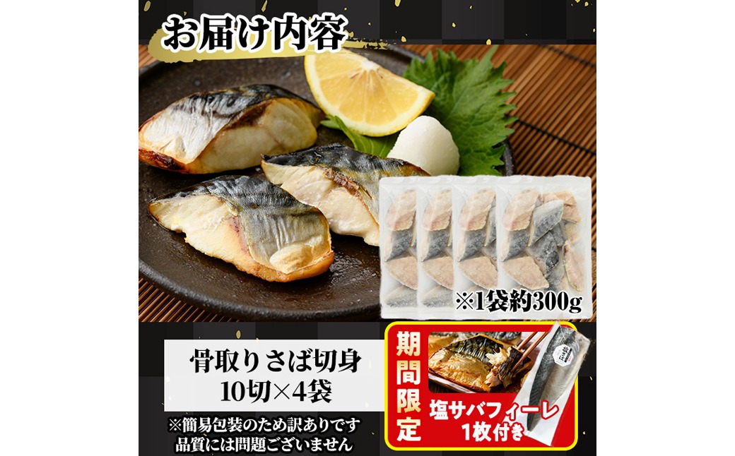 <訳あり>骨取りさば切身(40切れ) 骨とり サバ切身 小分け 切り身 鯖 さば 塩サバ 塩鯖 骨なし 骨取り済 カット済 塩焼き 簡単 フライ 魚 海鮮 冷凍 お弁当 おかず 【AW-47】【丸正水産】