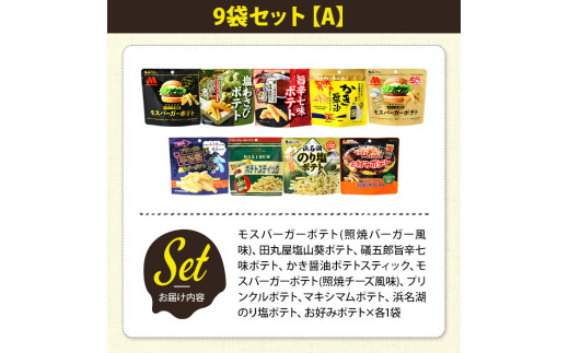 - <訳あり セットが選べる!> お試し 訳アリ じゃがスナック 【アソート・9袋セットA】 (9袋・1袋最大50g) 簡易梱包 お菓子 おかし スナック おつまみ ポテト モスバーガー テリヤキ わさび ワサビ 七味 かき醤油 アサムラサキ マキシマム のり塩 お好みソース オタフクソース 食べ比べ 送料無料 常温保存 【man226-A】【味源】