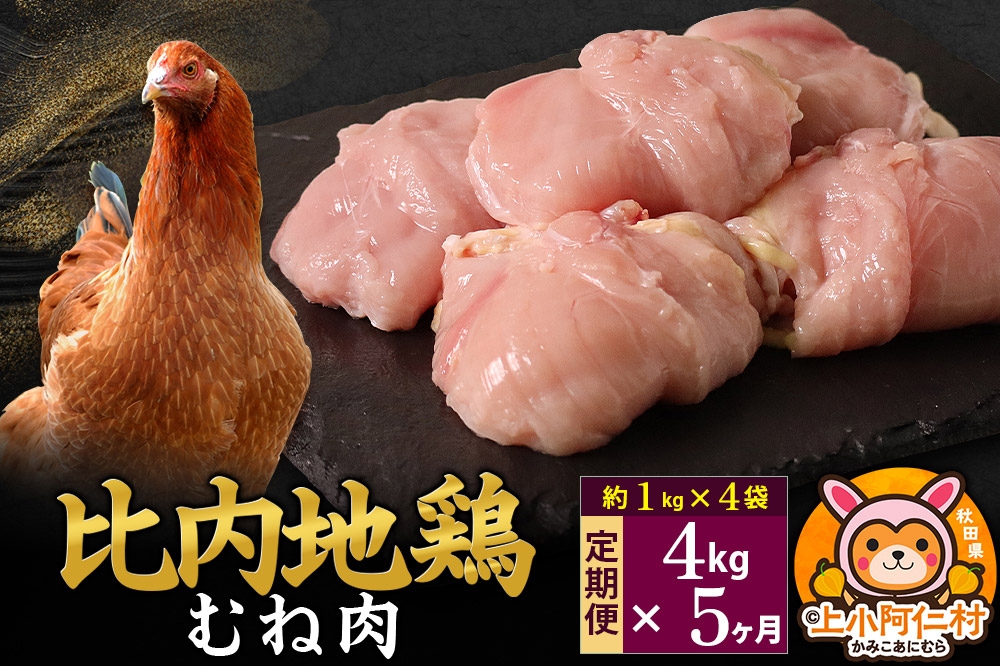 - 【定期便5ヶ月】比内地鶏 むね肉 4kg(1kg×4袋) 4kg 国産 冷凍 鶏肉 鳥肉 とり肉 ムネ肉