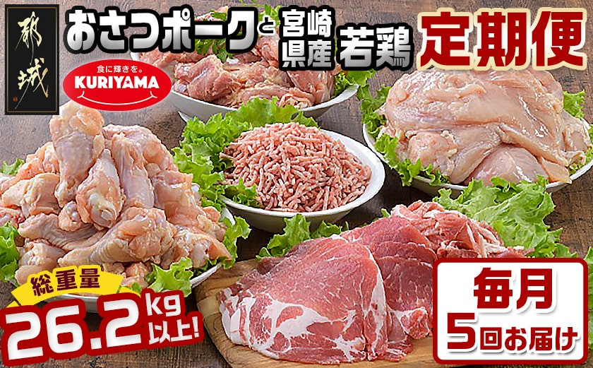 - 大容量!5回お届け!「おさつポーク」と宮崎県産若鶏定期便_T85(5)-1404_(都城市) 毎月 5回お届け おさつポーク 豚肉 県産若鶏 鶏肉 業務用 毎回5kg以上 冷凍