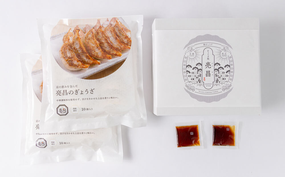 京都で行列が絶えない人気餃子店「ぎょうざ処 亮昌」の餃子です。地産地消を心がけ、餡には伏見・中嶋農園のキャベツや霜降り豚「京の都 もち豚」、ニラの代わりに京の伝統野菜「九条ネギ」などを使用。かつおだしベースで、京の料亭御用達「山利の田舎みそ」を加えて京風に味付けしており、中華調味料は一切不使用。京料理のような上品な香りと味わいで、いくらでも食べられるおいしい餃子です。