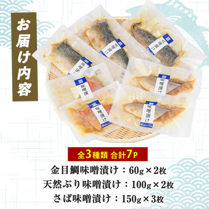【ふるさと納税】金目鯛!天然ぶり!さば!漁師がつくる味噌漬け(3種・合計7P) 魚 味噌漬け 焼き魚 焼くだけ 金目鯛 キンメダイ ブリ ぶり 鰤 サバ さば 鯖 総菜 詰め合わせ セット 【指宿山川水産合同会社】