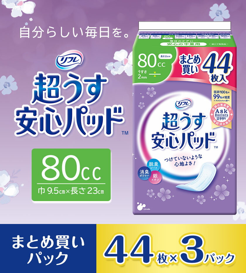 - 【ふるさと納税】リフレ 超うす安心パッド 80cc まとめ買いパック 44枚×3パック リブドゥコーポレーション 《30日以内に発送予定(土日祝除く)》徳島県 美馬市 パッド 尿ケア専用品 送料無料