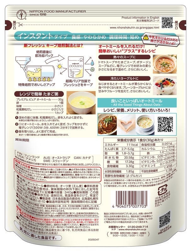 - 日食 プレミアムピュア オートミール(インスタントタイプ)340g×12袋 E043