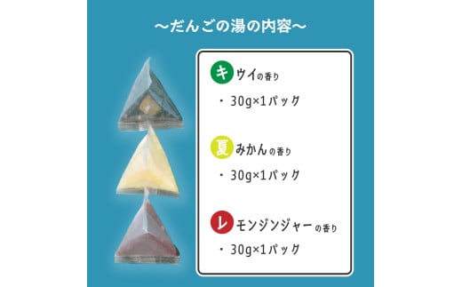 - だんごの湯(キウイ・夏みかん・レモンジンジャー) 30g×3種 | お風呂 入浴剤 坊ちゃん団子 キウイ 夏みかん みかん レモン ジンジャー 伊織 マツワカ 愛媛県 松山市