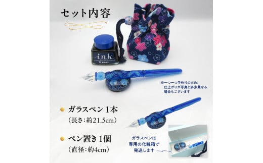 - ガラスペンセット・ペン置き付 選べる3種類(青) 文具 筆記具 インク 巾着 日本製 万年筆 つけペン おしゃれ 硝子 筆記用具 U01019-1
