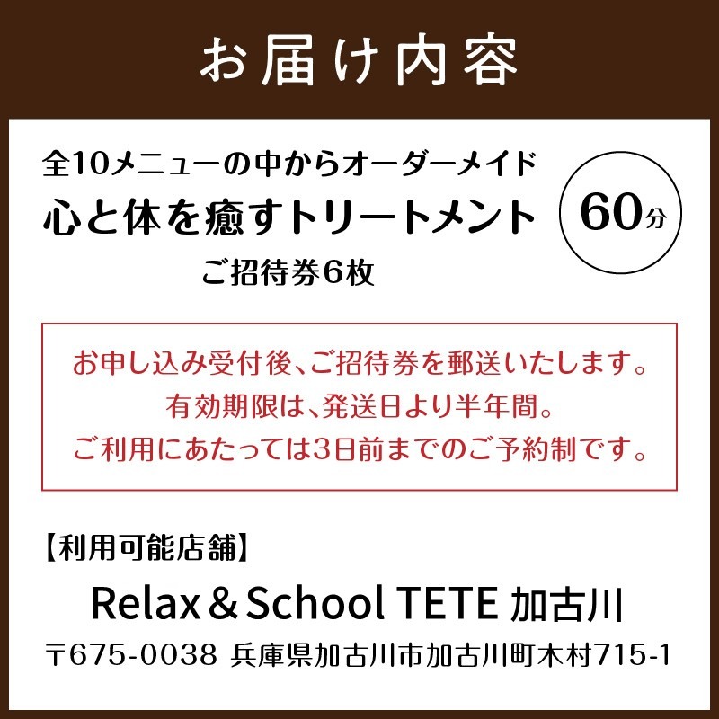 - 【体験型】全10メニューの中からオーダーメイド60分×6回券《 マッサージ リフレッシュ リラクゼーション チケット 癒し 疲れ 体験 》【2422L05401】