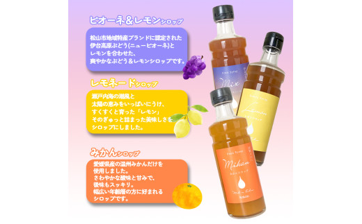 愛媛県産フルーツシロップ3本セット<レモネード・みかん・ピオーネ&レモン>(簡易箱入り)|シロップ 果実シロップ 愛媛 シロップセット レモネード みかん ぶどう