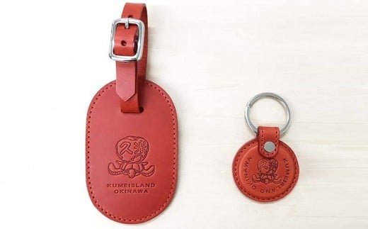 久米島の亀ロゴ入り革製ラゲッジタグ(赤)&キーホルダー(2枚革赤)