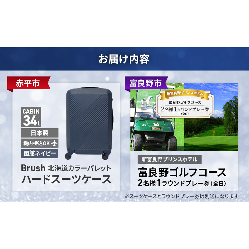 - 【赤平市×富良野市共通返礼品】Brush 北海道カラーパレットハードスーツケース × 富良野ゴルフコース 2名様1ラウンドプレー券(全日) 北海道 赤平市 富良野市 コラボ 共通返礼品