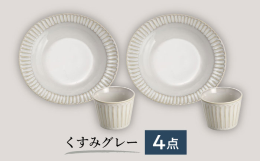 - 【美濃焼/みずなみ焼】 しのぎ カレーパスタ皿&カップ 各2個 くすみグレー ペアセット 瑞浪市 / 山喜製陶 プレート マルチカップ 食器 [AZCP003]