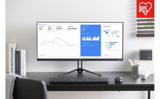 画面を広々と使える幅広サイズのモニターです。モニターを2台置けないスペースでも、これ1台で複数ウィンドウを並べて表示できるので、省スペースで作業効率をUPできます。ギラつきを抑えた非光沢タイプ。ブルーライトを「強」「弱」「OFF」の3段階で調整でき、フリッカー(画面のちらつき)もなくすなど、目の負担を減らす工夫がされています。