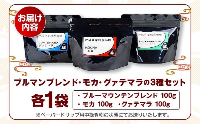 【自家焙煎】ブルマンブレンド・モカ・グァテマラの3種セット 珈琲 コーヒー コーヒー豆 ドリップ ギフト 沖縄市 / 沖縄市観光物産センター夢プラザおきなわ [BCBE008]