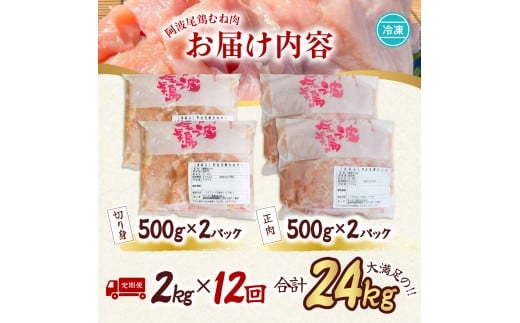【阿波尾鶏のお肉定期便 12か月連続】阿波尾鶏むね肉2kg 12回お届け 12ヶ月定期便 阿波尾鶏 むね肉 約24kg (約2kg×12回) 冷凍 切り身 正肉 セット 徳島 地鶏 あわおどり
