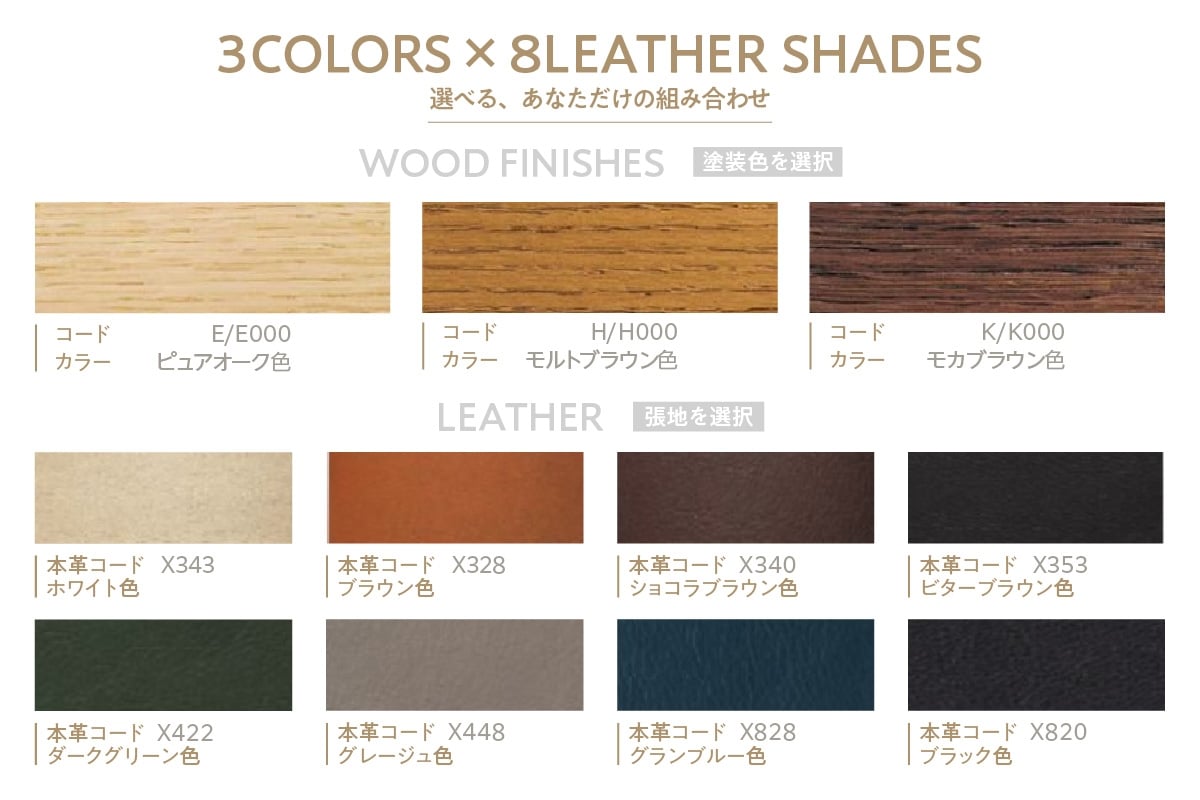 しっとりとした革で、豊かな座り心地を実現するデスクチェアです。すっきりと収納できる脚載せやリクライニング機能もついており、リビングでの使用やゲーミングチェアにも適しています。革の張地は8色から選べます。