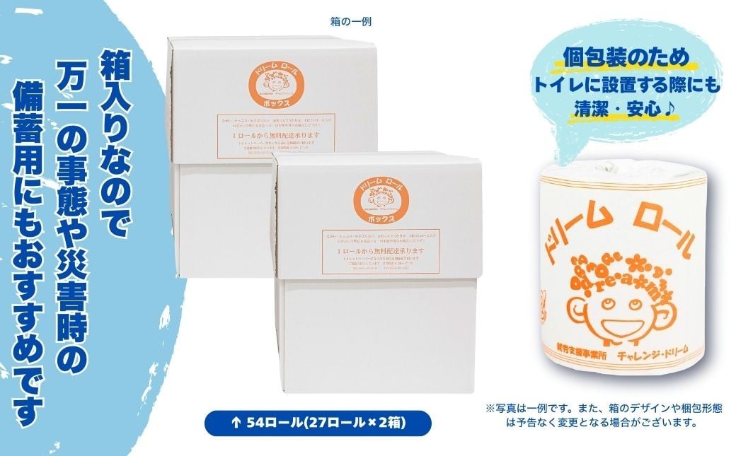 - 【就労支援】 トイレットペーパー 個包装 ダブル ドリームロール 27ロール×2箱 計54ロール 【1個:長さ30m】 再生紙 紙 トイレ用品 生活用品 生活品 生活必需品 消耗品 備蓄 防災用品 日用雑貨 生活雑貨 新生活 SDGs リサイクル エコ 人気 山梨県 西桂町【n0487_tii_A】