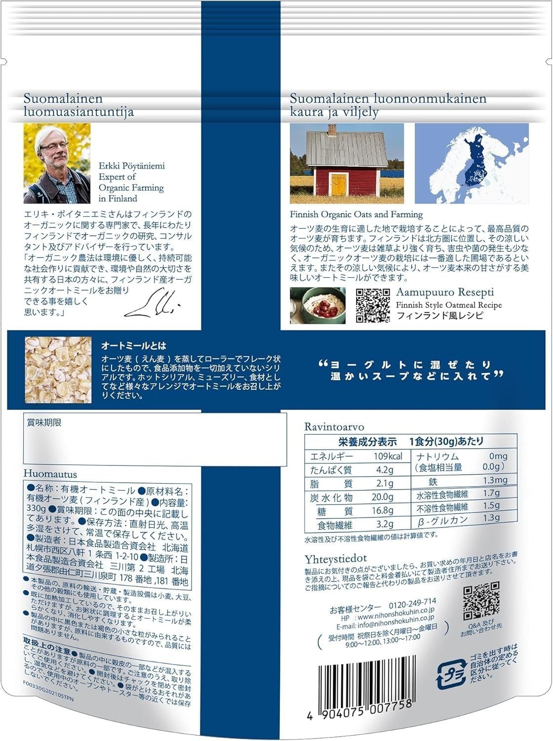 - A20 フィンランド産 オーガニックオートミール「無添加 オーガニック インスタントタイプ」330g×12袋