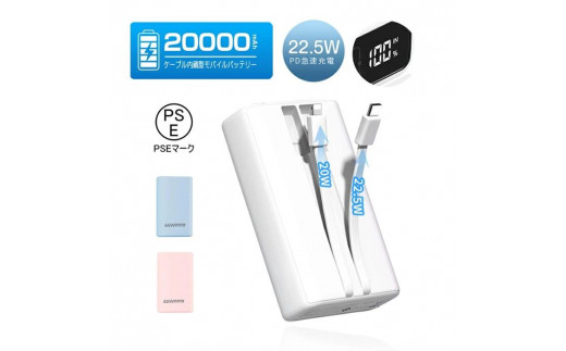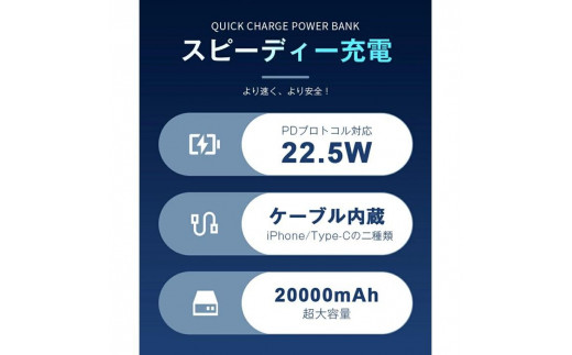 - モバイルバッテリー<ブルー>20000mAh 大容量 2本ケーブル内蔵 防災電源 USB-A出力 Type-C出力ケーブル Type-C入力 iPhone入力 iPhone出力ケーブル 3台同時充電 5A 急速充電 PD 22.5W QC 3.0 パワーバンク 多機種対応 LCD 残電量表示 持ち運び便利 安定出力