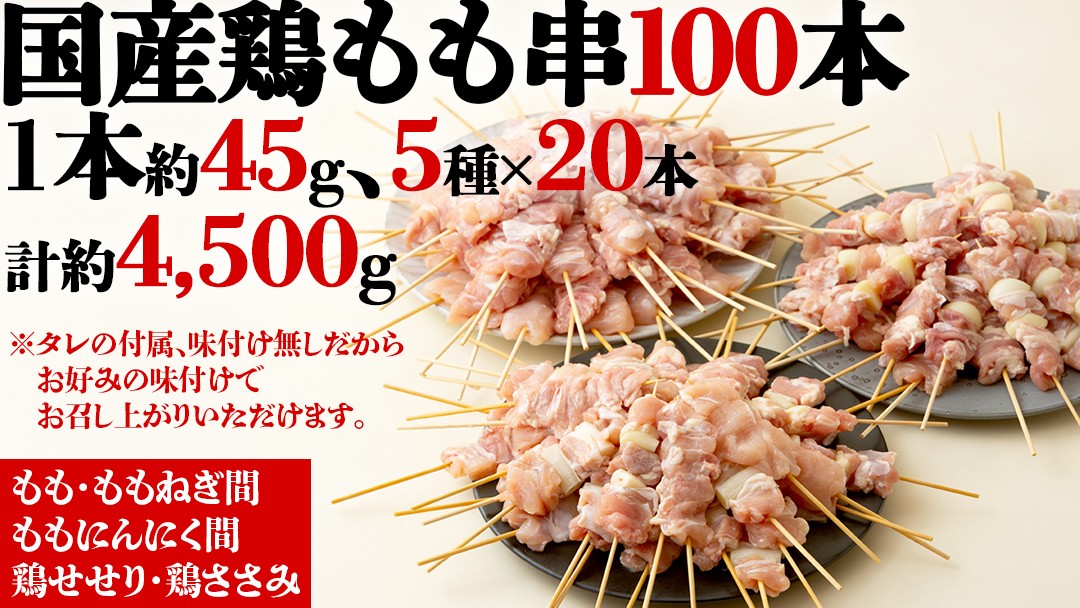 1本45g×100本!合計約4500g!ボリュームたっぷり、国産鶏 焼き鳥 5種100本 セット (各20本入り) 焼鳥 鶏肉 おかず おつまみ