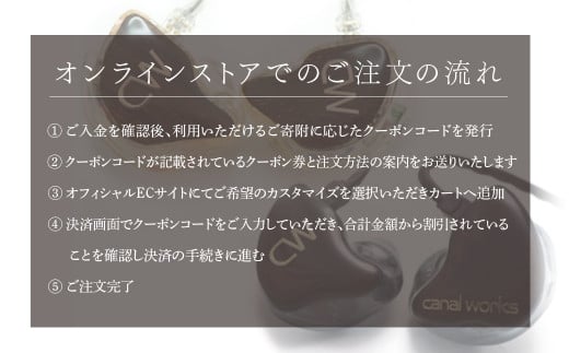 - カナルワークス オンラインストア クーポン券 9,000円分 | クーポン イヤホン インイヤーモニター IEM ハンドメイド 音楽鑑賞 オーディオ ミュージシャン エンジニア 音響 モニタリング プロ仕様 ポップス ロック アニソン クラシックジャズ 埼玉県 所沢市