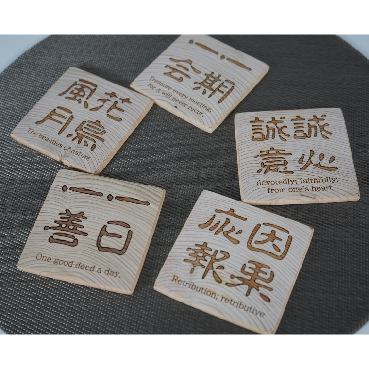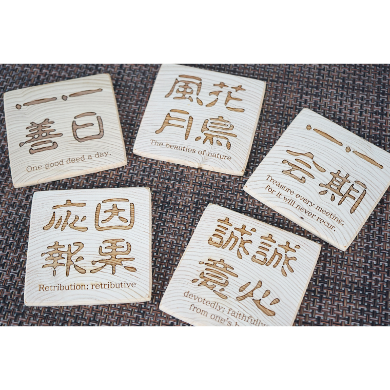- ヒノキの四字熟語コースター 5種セット|茨城県産 大子町 ひのき 木 漢字 コースター セット 天然ヒノキ 四字熟語(BH013)