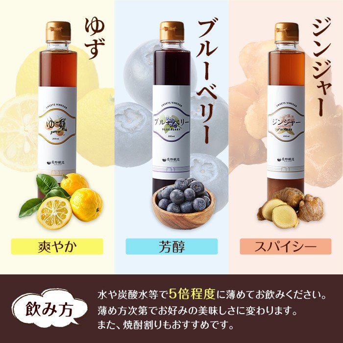 スイートビネガー 200ml×3本セット(ゆず・ジンジャー・ブルーベリー) 飲む酢 詰め合わせ ギフト 【しばたの未来】sh004