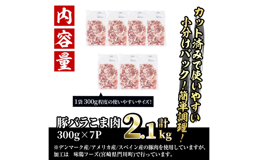 <訳あり>豚バラこま肉(計2.1kg)小分け 豚肉 お肉 おにく 焼肉 やきにく しゃぶしゃぶ 鍋 惣菜 生姜焼き 豚丼 便利 宮崎県 門川町【V-30】【味鶏フーズ 株式会社】