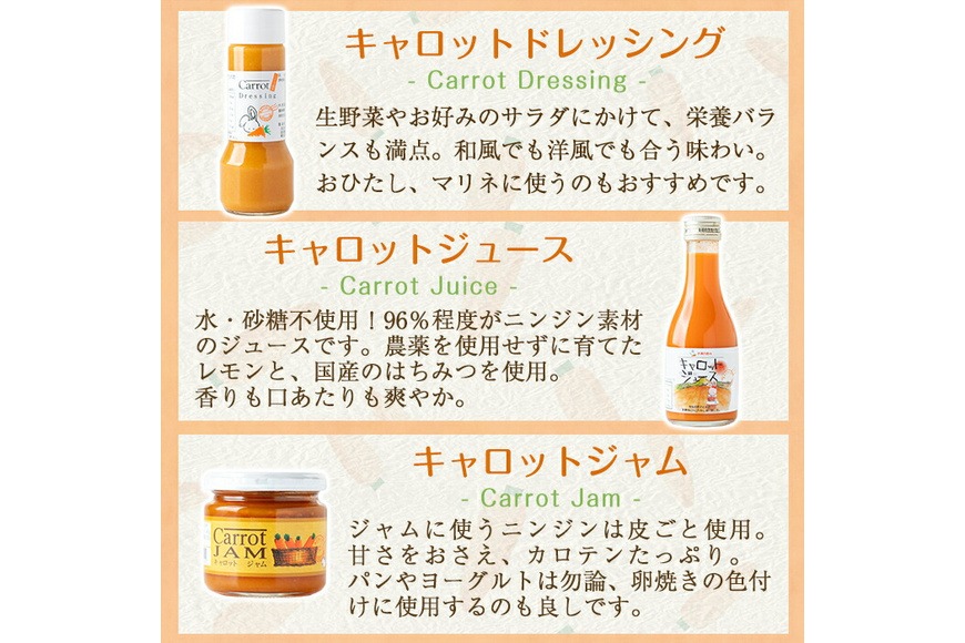 a863 甘さ凝縮!くまはいニンジン・キャロットギフトC(ドレッシング3本、ジュース小1本、ジャム2個)【加治木町農産加工】国産 加治木町産 人参 にんじん ニンジン 人参ジュース 野菜ジュース ジュース くまはい 詰合せ セット 常温 常温保存
