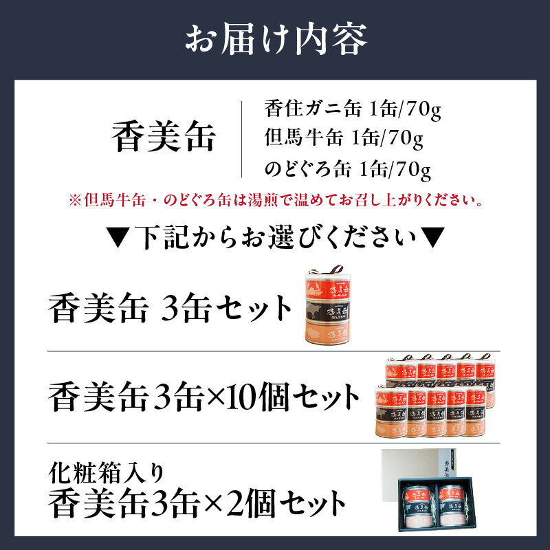 - 【ふるさと納税】海山の幸を使った豪華な缶詰3点セット【選べるセット数】香美缶 缶詰 3種 セット カニ缶 ずわい蟹 但馬牛 のどぐろ ズワイガニ 蟹 カニ 加工食品 魚貝類 フレーク 紅ズワイガニ ほぐし身 味付缶 保存食 常備食 非常食 備蓄 キャンプ キャンプ飯 送料無料