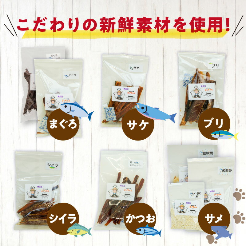 【ふるさと納税】犬猫用 国産無添加おやつジャーキー 選べる 種類 まぐろ 本マグロ 血合い サケ ブリ シイラ 鰹スティック 鮫軟骨 鮫粉末 魚シリーズ 5袋詰め合わせ ペット ペットフード ペット用品 ドッグフード