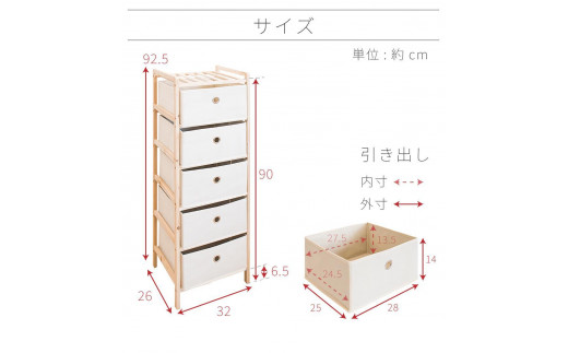 - 天然木 ファブリックチェスト5段 約幅32cm×奥行26cm×高さ92.5cm BYT1044469