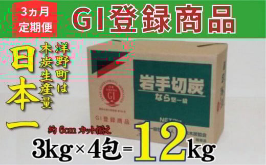 【3ヵ月定期便】岩手切炭3kg×4個 GI登録商品 生産量日本一 高品質 高火力 なら堅一級 アウトドア キャンプ BBQ バーベキュー